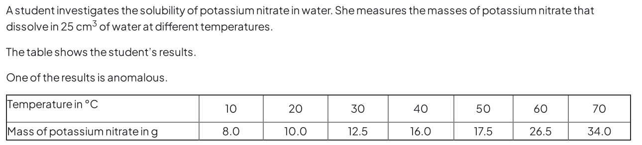 Use your graph to find the maximum mass of potassium nitrate that dissolves in 25 cm of water at 75 °C. Show on your graph how you obtained your answer.