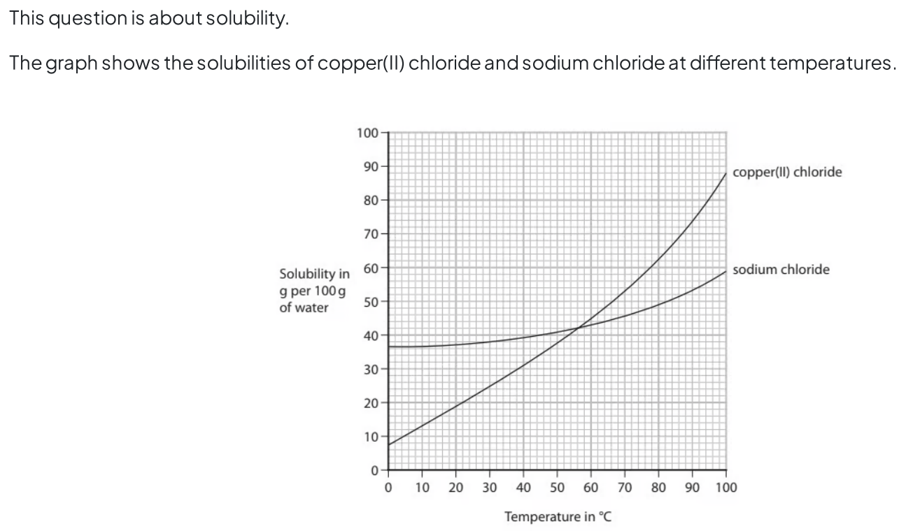 Determine the temperature at which copper(II) chloride and sodium chloride have the same solubility. Show on the graph how you obtained your answer.