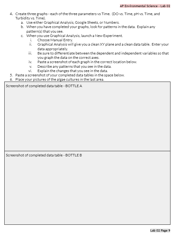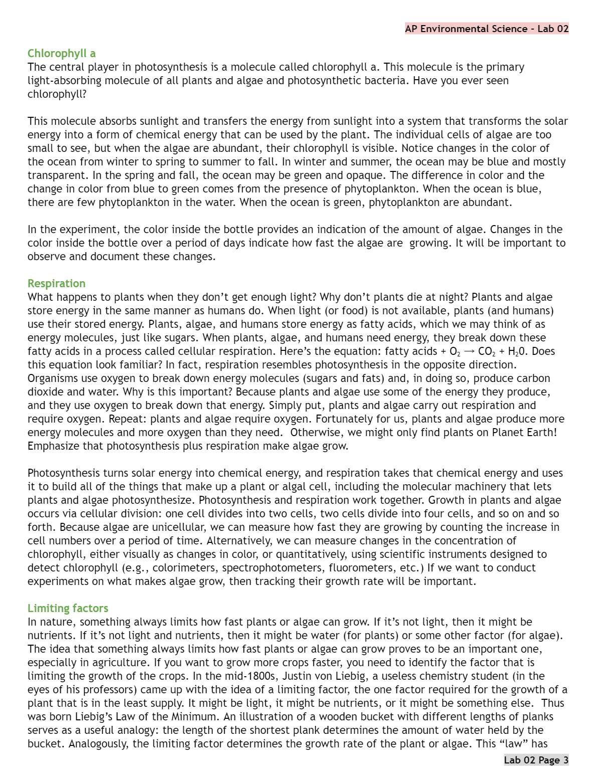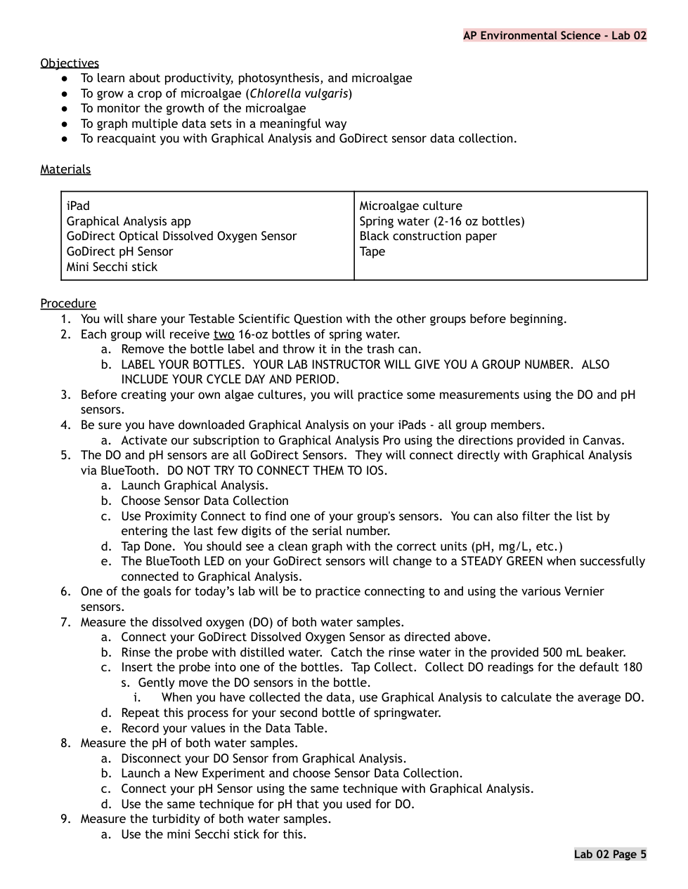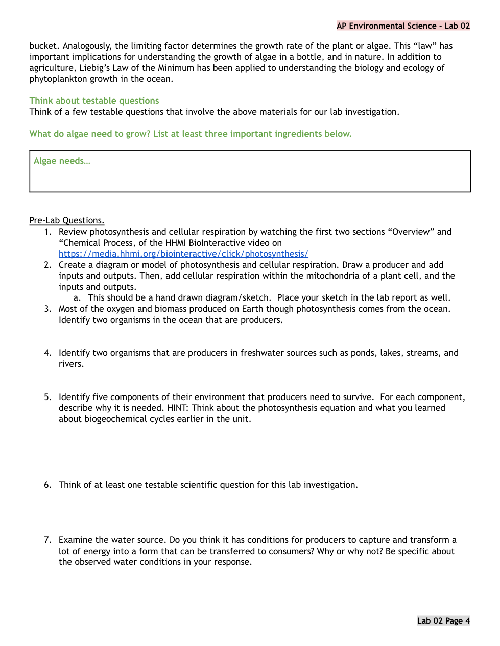 APES Lab 02 PRE LAB Algae Cultures Primary Production