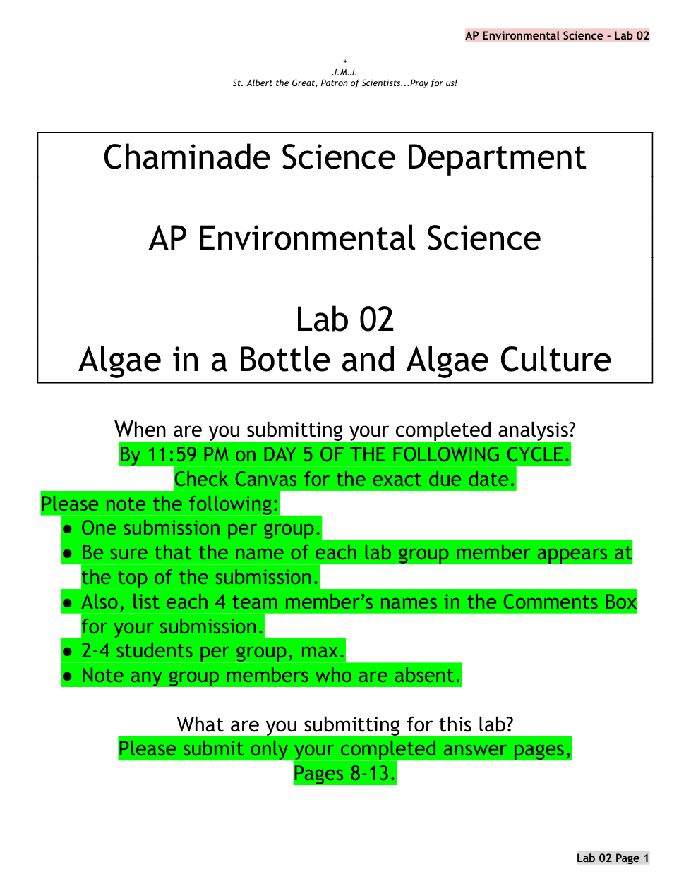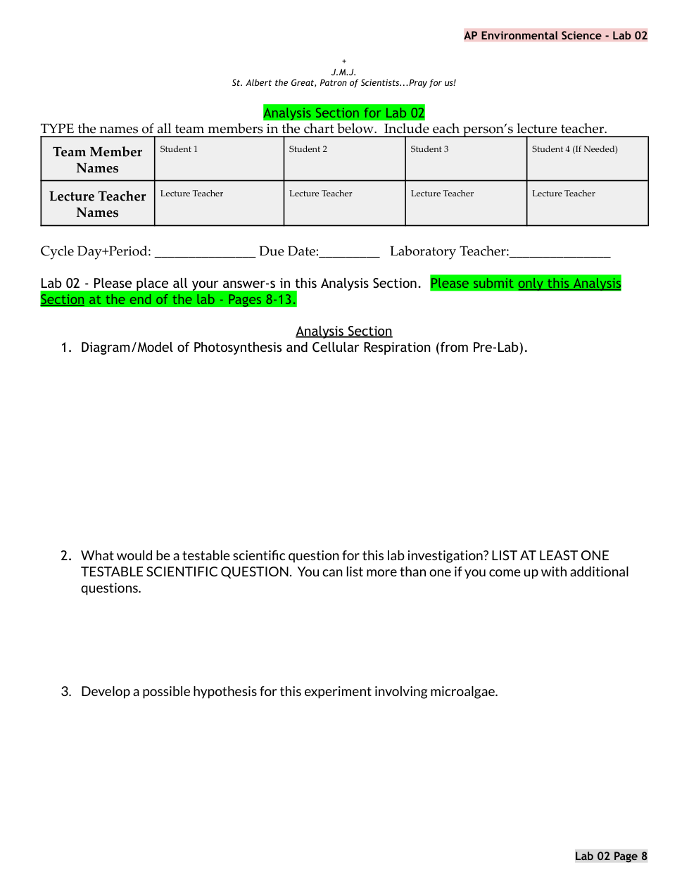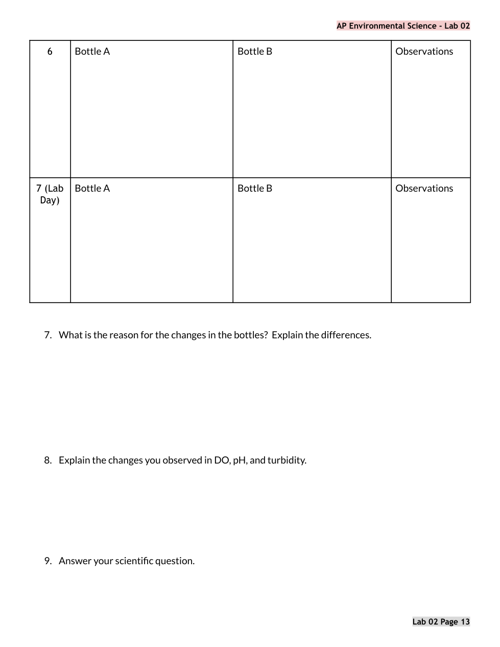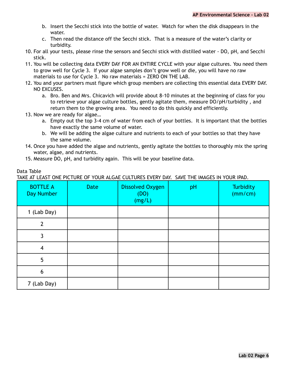 APES Lab 02 PRE LAB Algae Cultures Primary Production
