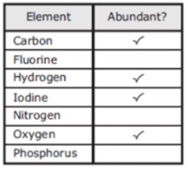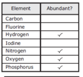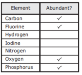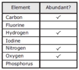 Students were given a list of seven elements and asked to identify the four elements that are the most abundant in macromolecules. Which table correctly identifies the four most abundant elements in macromolecules.