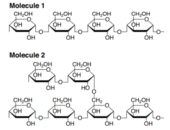 The structural formulas shown below represent parts of two different complex macromolecules. Molecules 1 and 2 differ in their overall structure.