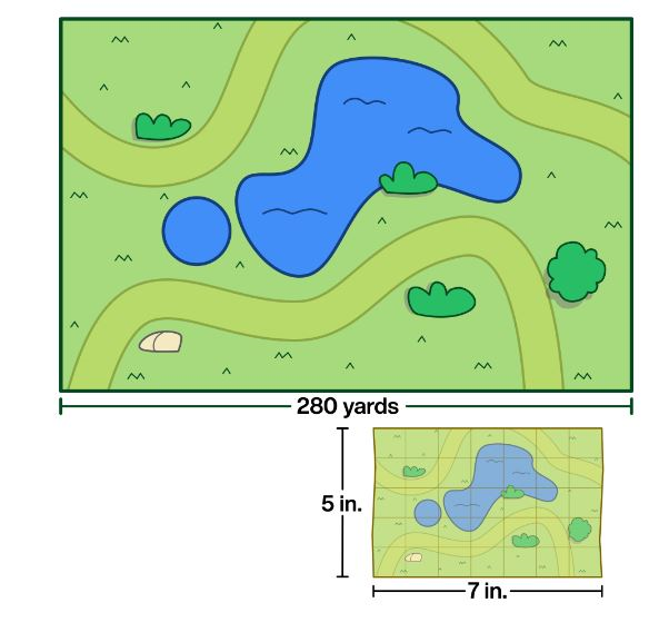 A scale drawing of a rectangular park is 5 inches wide and 7 inches long. The actual park is 280 yards long. What is its area?