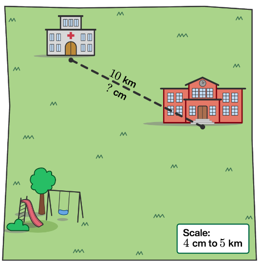 10 kilometers apart. What should the distance between the school and the hospital be on the map?