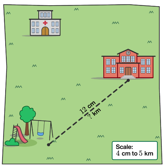 On the map, the school and the playground are 12 centimeters apart.