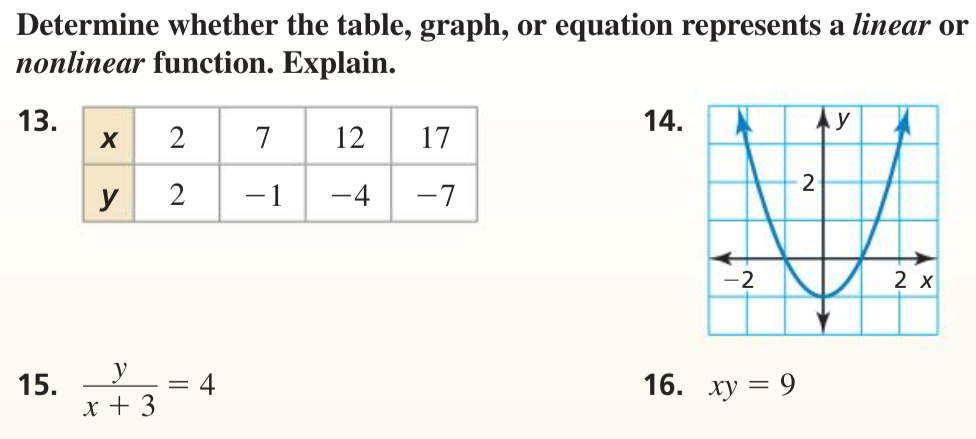 Determine whether the table, graph, or equation represents a linear or nonlinear function.