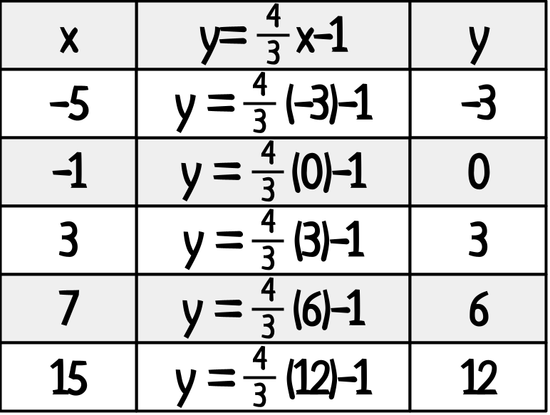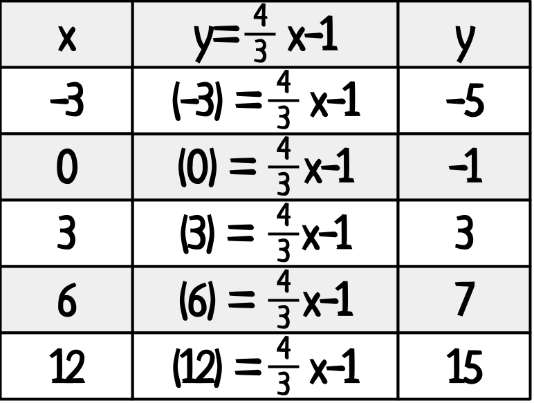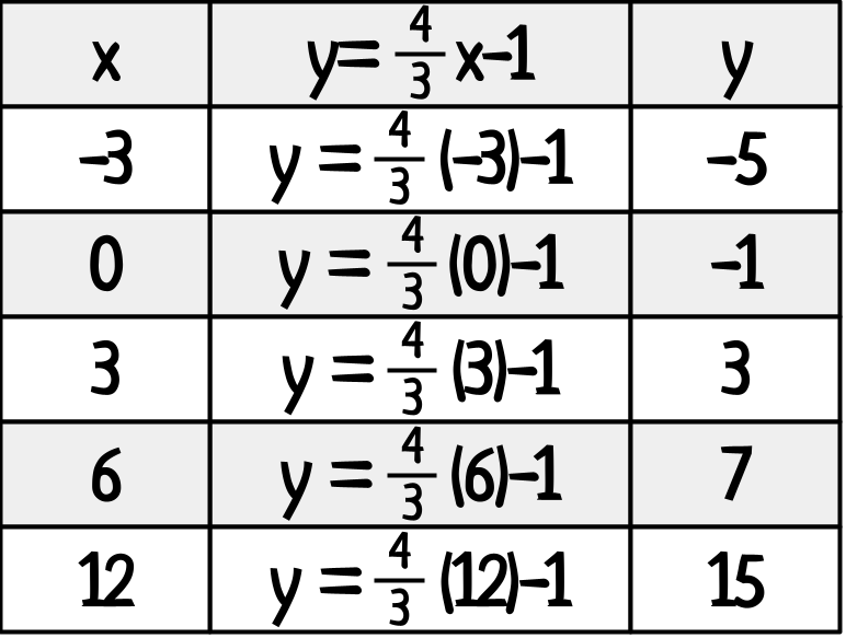 Choose the correct table and graph that represents the functiong(x)=\frac{4}{3}x-1