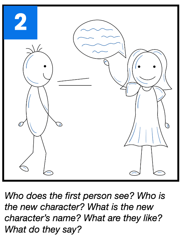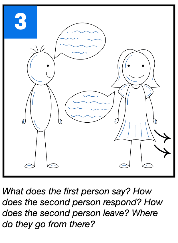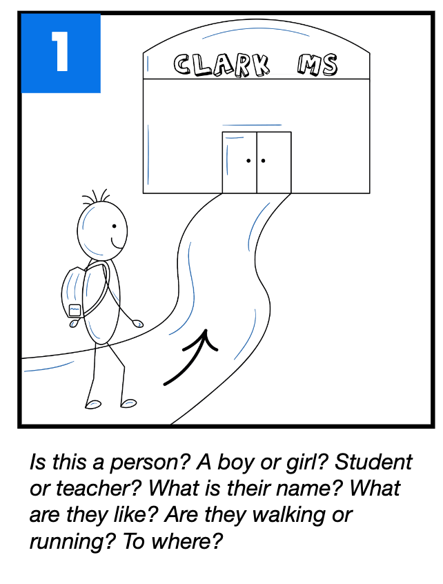 PRESENTATIONAL WRITING ASSESSMENT - Instructions: Write two sentences in Spanish to describe each picture. Use the suggestions below each picture to get ideas! Try to use the Spanish words for “runs”, “walks”, and “sees” at least once in the story.