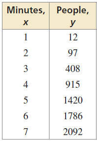 The table shows the total numbers y of people who reported an earthquake x minutes after it ended.