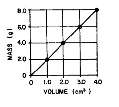 The masses and volumes of four samples of a material were determined by a laboratory experiment. The graph shown indicates the results
