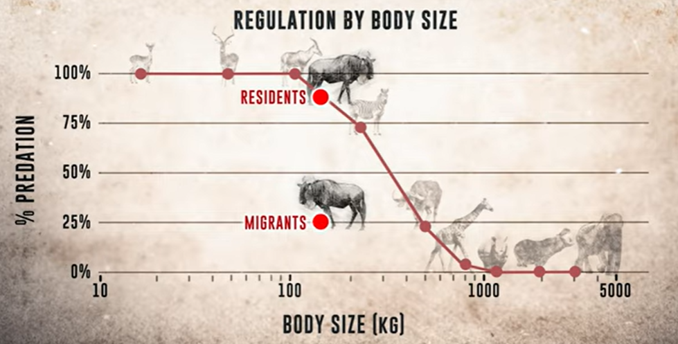 From the video: According to their size, you would expect that wildebeests are more likely to be regulated from the top-down. This is true for the resident wildebeests (those that don't migrate). Why is this NOT the case for the migrating wildebeests?