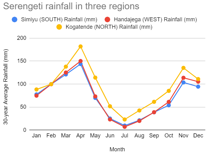 We thought that food availability (measured by rainfall) might explain wildebeest movement. In which region(s) do we still need to figure out?