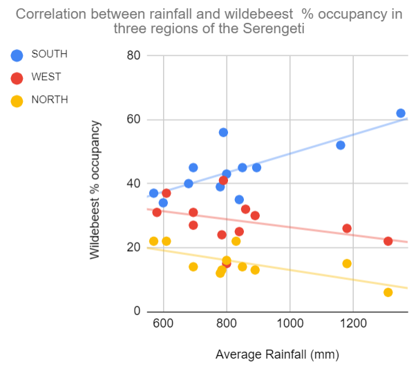 Based on the graph, 1. Write a sentence that DESCRIBES the trend seen across the entire Serengeti.2. Write a sentence that CONNECTS this trend to trends from previous lessons.
