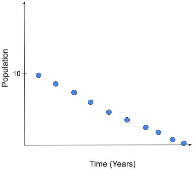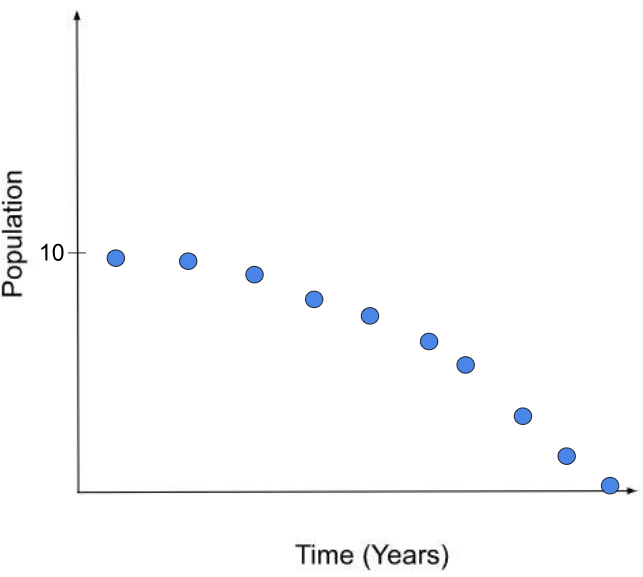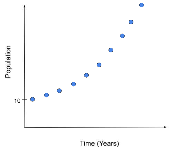 Which of the graphs best represents what you predict should happen to a single pack of wild dogs over 10 years if there were enough resources for all the dogs to survive and the death rate was very low.