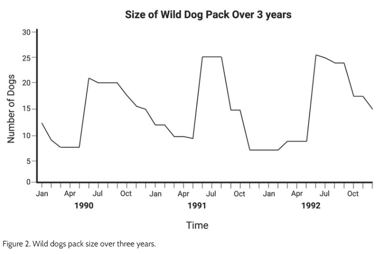 The graph below shows the population of one pack of wild dogs in Kruger National Park in South Africa, where the dogs have been protected and studied. (Figure 2)