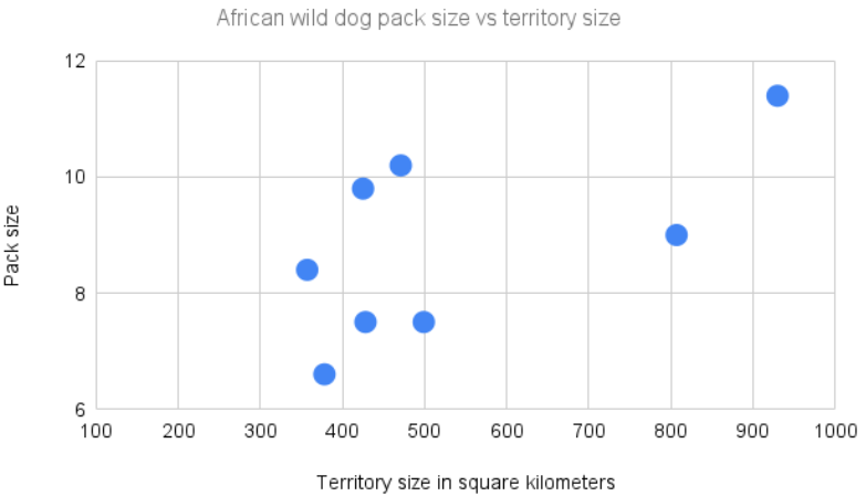African wild dogs are known to hunt and roam over large areas of land called territories. Scientists wondered how territory size could limit pack size. They wanted to use this information to figure out how many dogs the new reserve in Malawi could support. The graph below shows the data they collected comparing pack size to territory size.