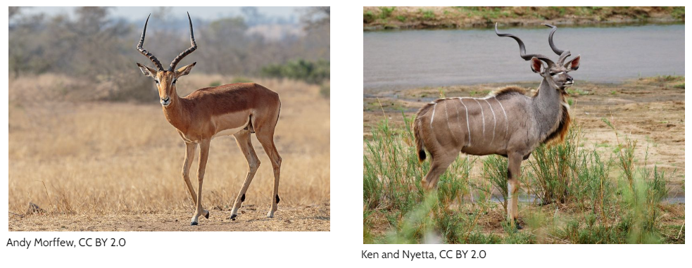 African wild dogs' main prey are impala (on the left)  and kudu (on the right).