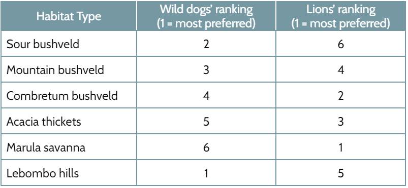 Like wild dogs, lions also prey on kudu and impala. Lions and wild dogs often live in the same habitats. However, lions will kill wild dogs they encounter. In South Africa, scientists investigated the relationship between lions and wild dogs by looking at habitat preferences (Table A). Scientists ranked each animal's preferred habitats from 1 to 6, with one being the more favored and six being the least.