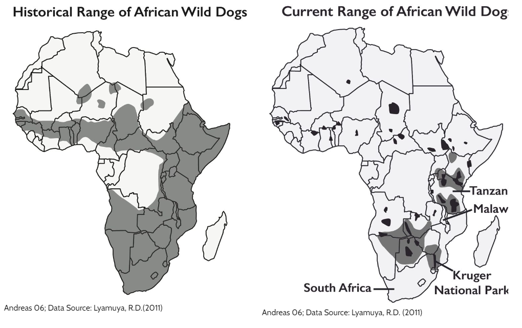 African wild dogs used to live across 39 African countries. Due to habitat loss and conflicts with humans, there are now only around 6,600 African wild dogs in 14 countries, and the population is listed as endangered internationally (Nicholson et al., 2020).