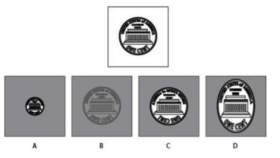 The first picture shows a penny under a bright light. Which labeled picture shows how the penny will look different when the light is turned off?