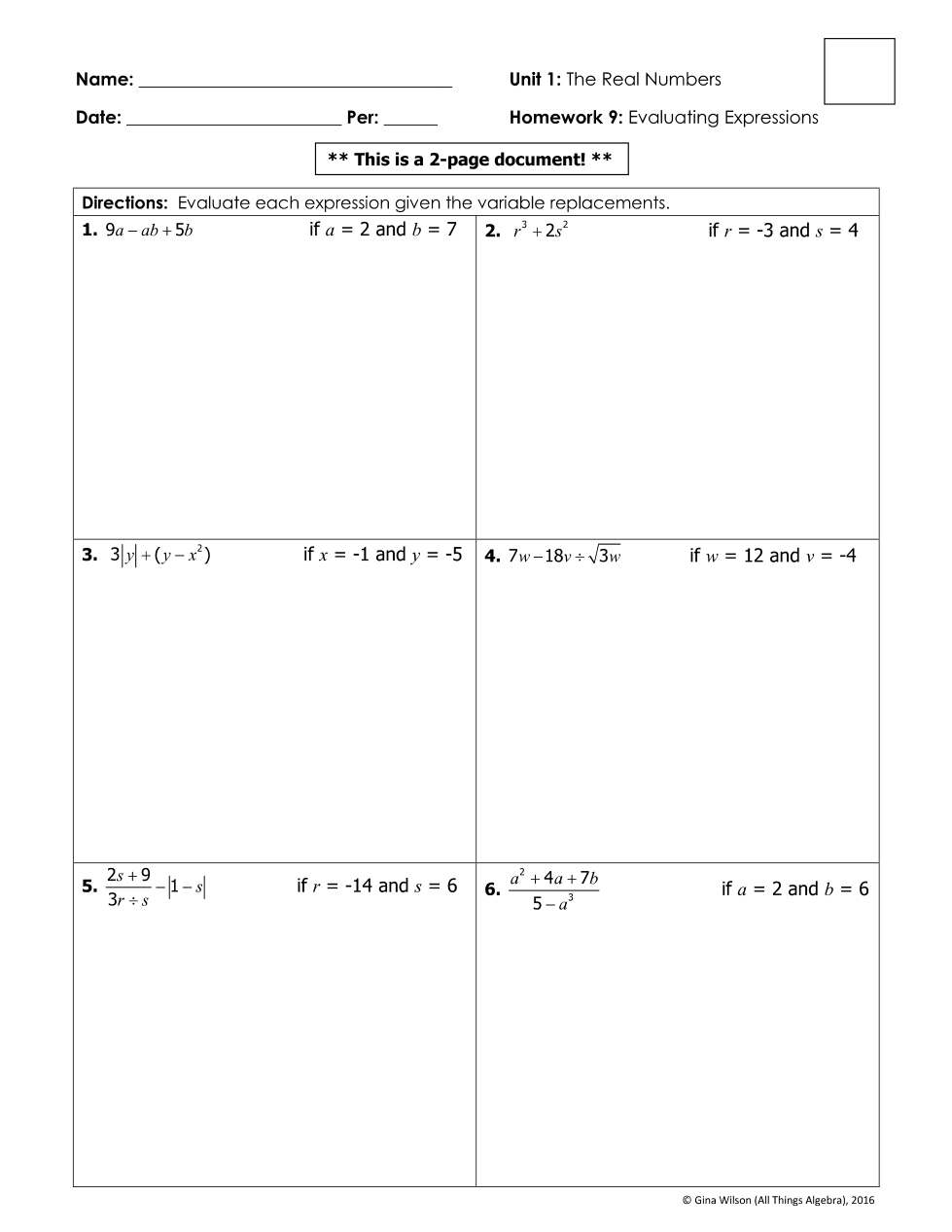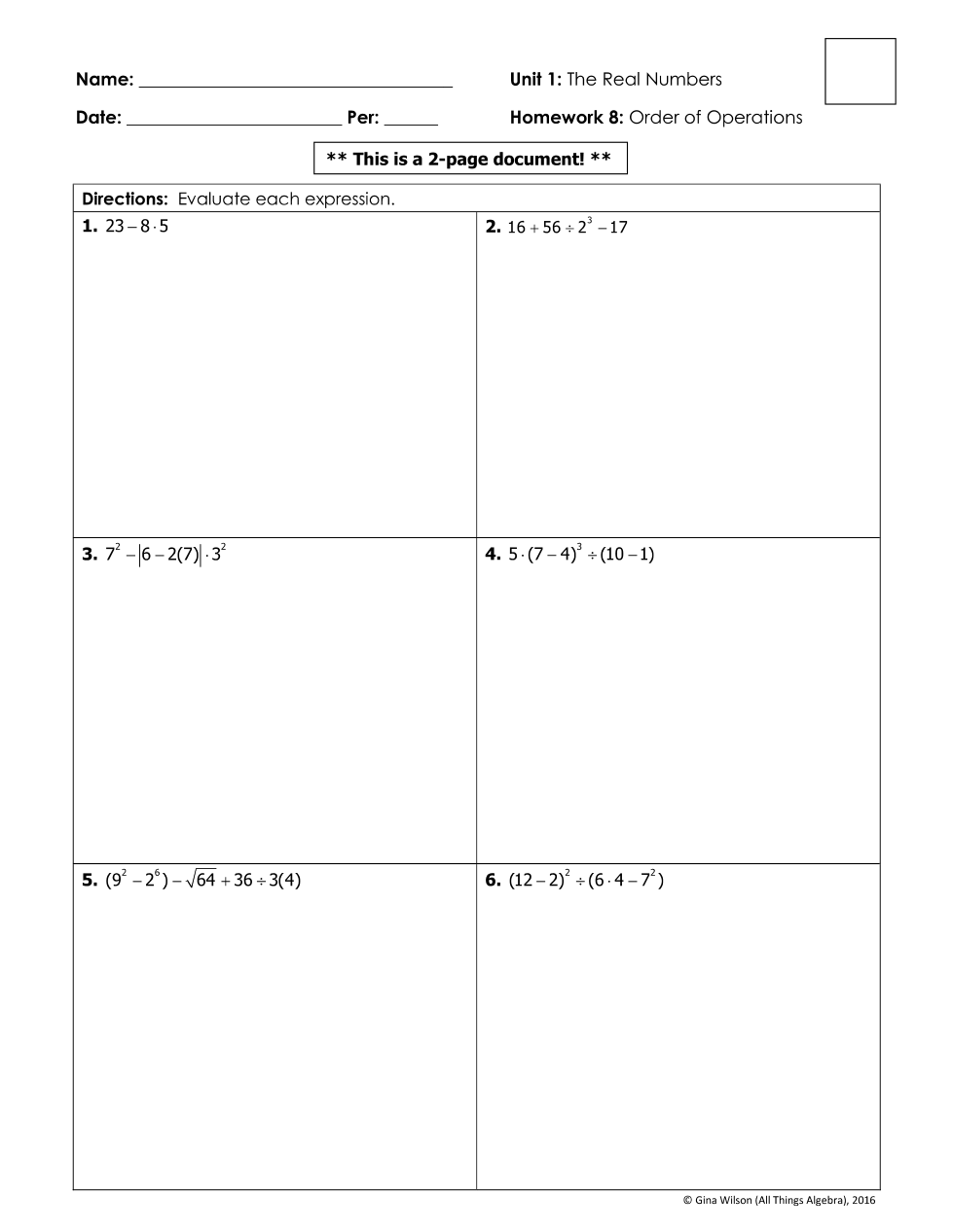 Unit 2a-1: Order of Operations and Evaluating Expressions