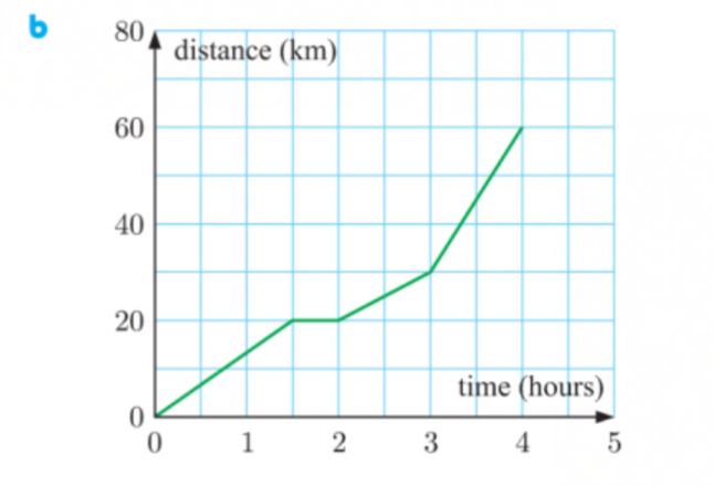 Wingyi walks for 30 minutes from her home to the post office which is 3km away. She waits in line for 15 minutes, then walks home, taking 45 minutes. Draw a travel graph to illustrate her journey - don’t forget to label the axis.
