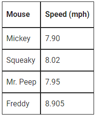 Simon measures the speed of mice in his lab. He recorded the following time below.