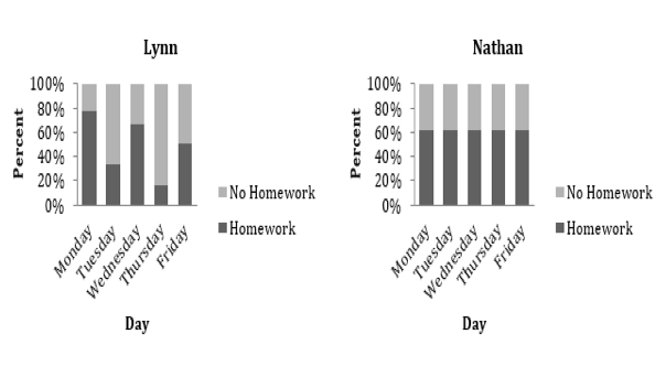 Two friends attend different schools and are curious if there is an association between day of the week and whether homework is assigned in math class. For a semester they track if they have homework each day of the week. The segmented bar charts display the frequency with which homework is assigned each day of the week during this semester: