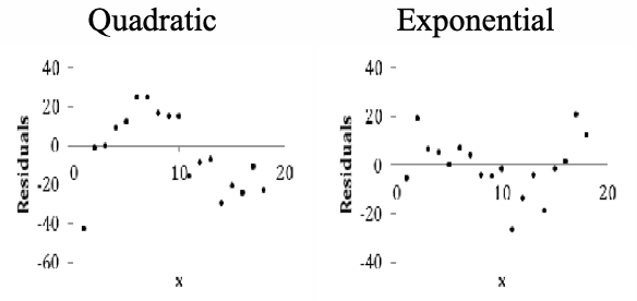 An exponential model and a quadratic model were calculated for the relationship between two variables, x and y. Here are the residual plots for the models: