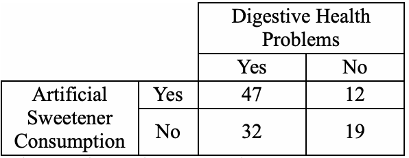 A medical researcher is interested in determining if there is a relationship between the consumption of artificial sweeteners and digestive health.