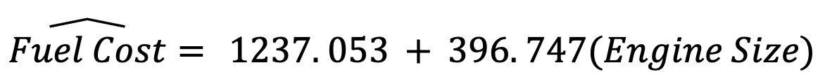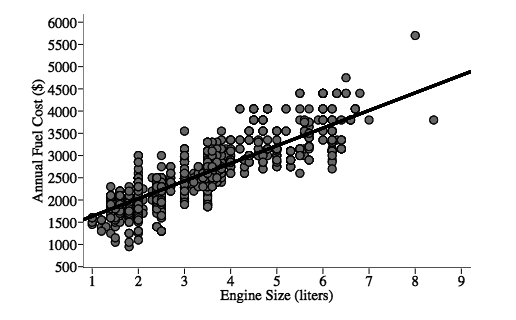 How do fuel costs relate to a vehicle's engine size? The scatterplot and regression equation display this relationship for all conventional fuel vehicles from the current model year.