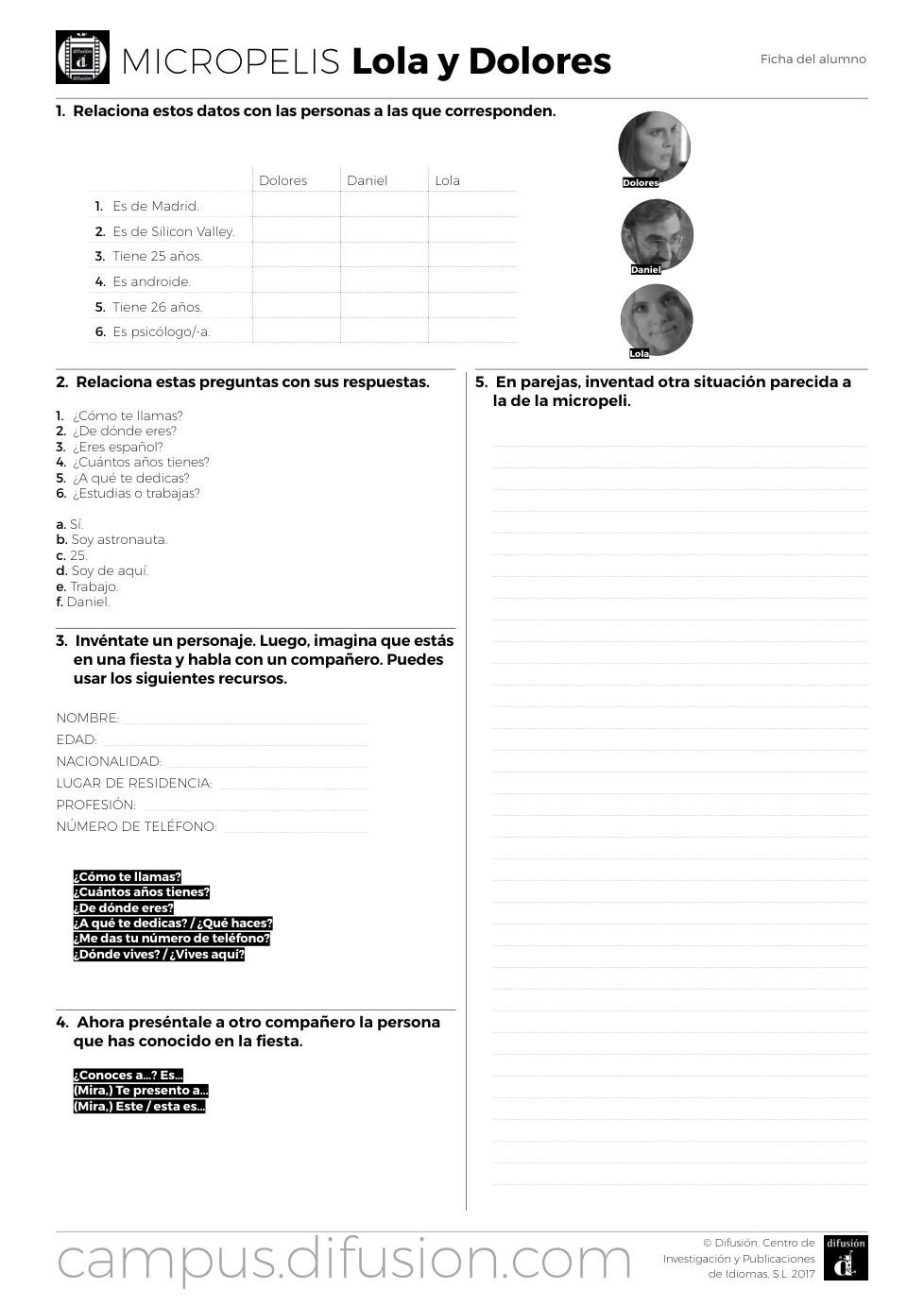 - ¿Cómo te llamas? ¿Cuántos años tienes? ¿De dónde eres? ¿A qué te dedicas? / ¿Qué haces? ¿Me das tu número de teléfono? ¿Dónde vives? / ¿Vives aquí?