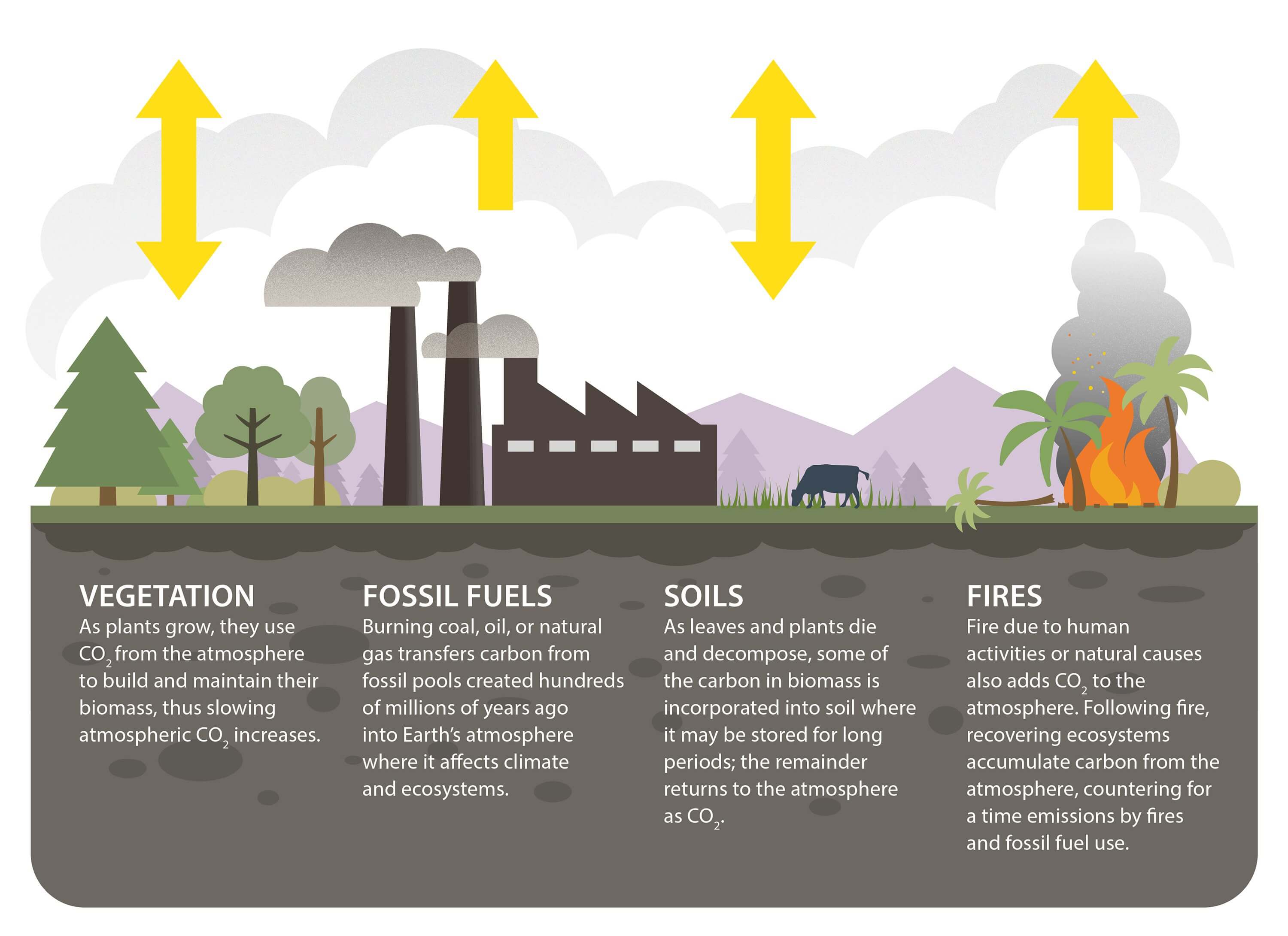 Based on the image to the left, how are fossil fuels connected to the creation of C02 in the Earth's atmosphere?