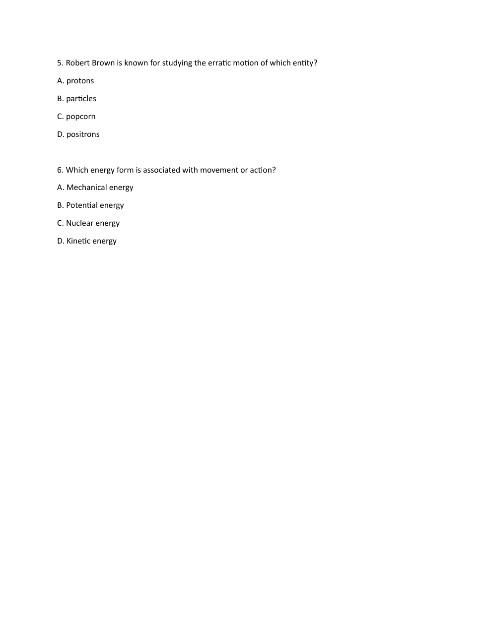 Question 5: Robert Brown is known for studying the erratic motion of which entity?