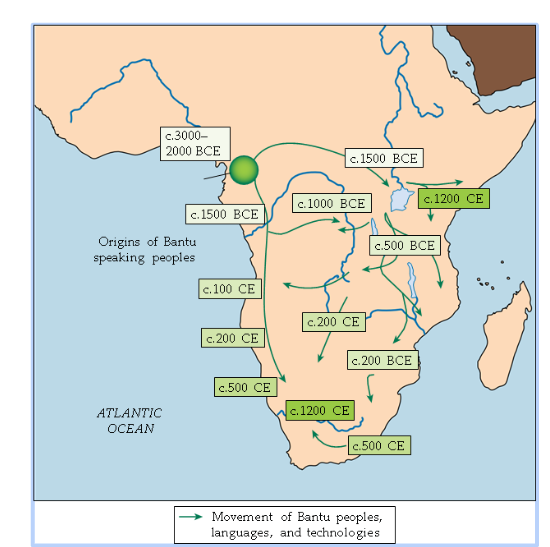 Using the Bantu Migration map, which of the following areas represents the origin point for the Bantu people?