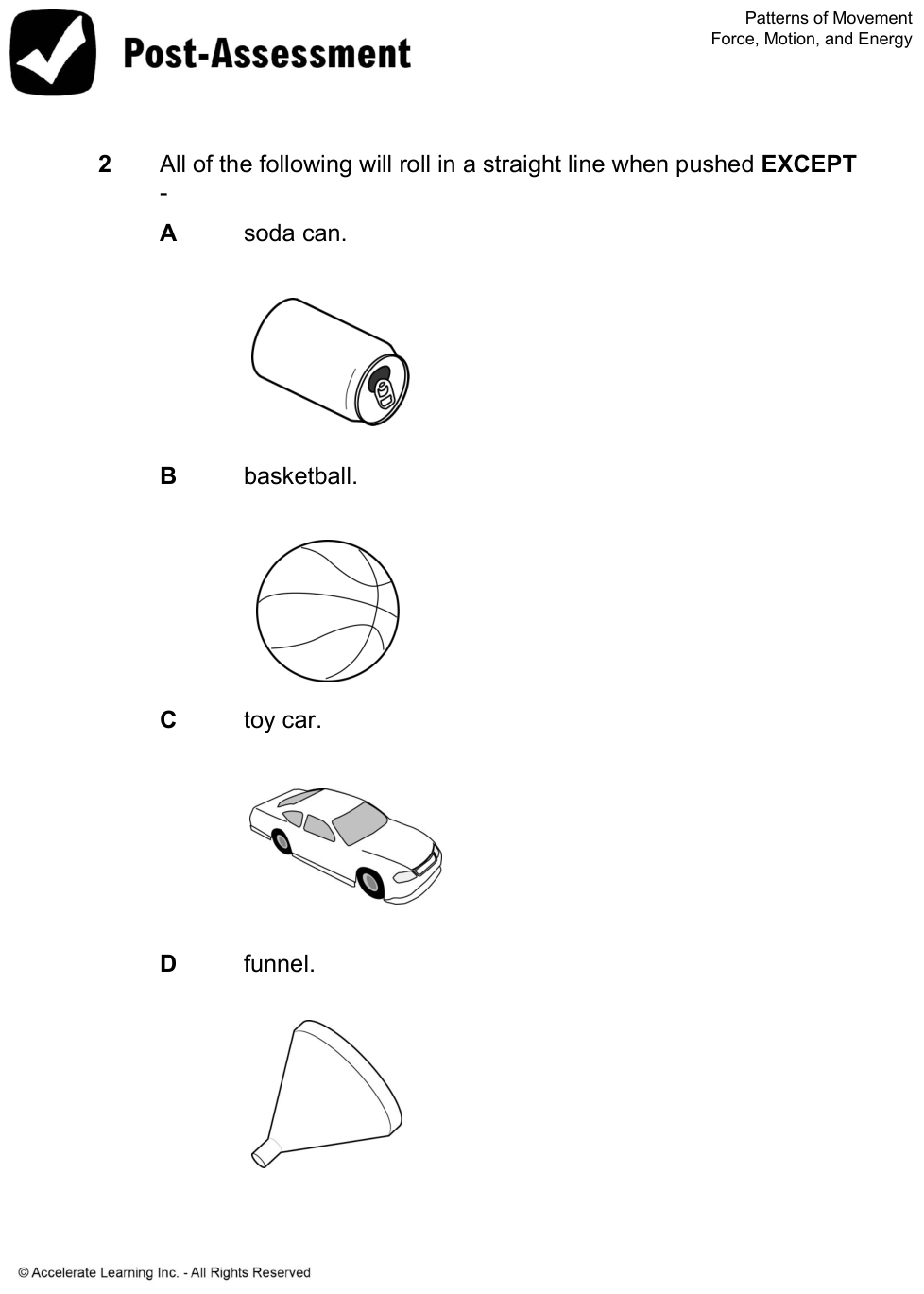 Students let a car roll down a ramp. Once the car reached the bottom, what path would it most likely take?