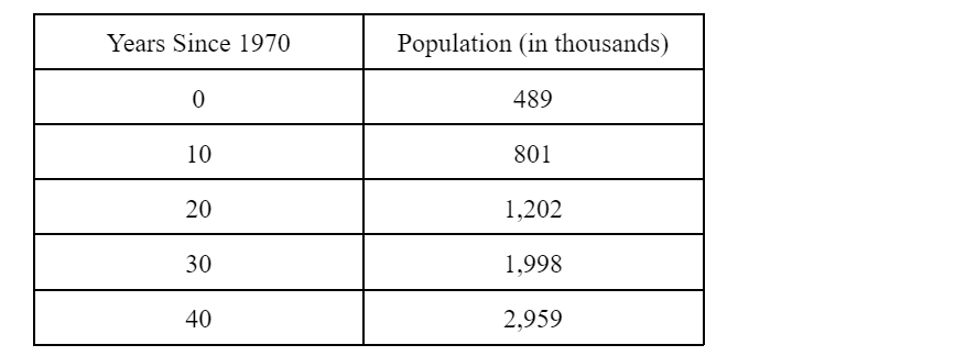 Find the curve of best fit for the relationship of numbers of years since 1970 and population in thousands. Round to 2 decimal places.