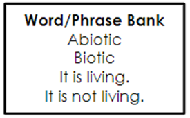 Write a complete sentence to tell whether each picture shows an abiotic or biotic factor. Use the word/phrase bank to help you.