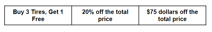Your family needs a set of 4 tires. Discount Tires sells each tire for $150 each. The store has a few sales going on listed in the table below. Which of the following deals would you prefer? Calculate what your family would pay to help you decide which deal is the best.