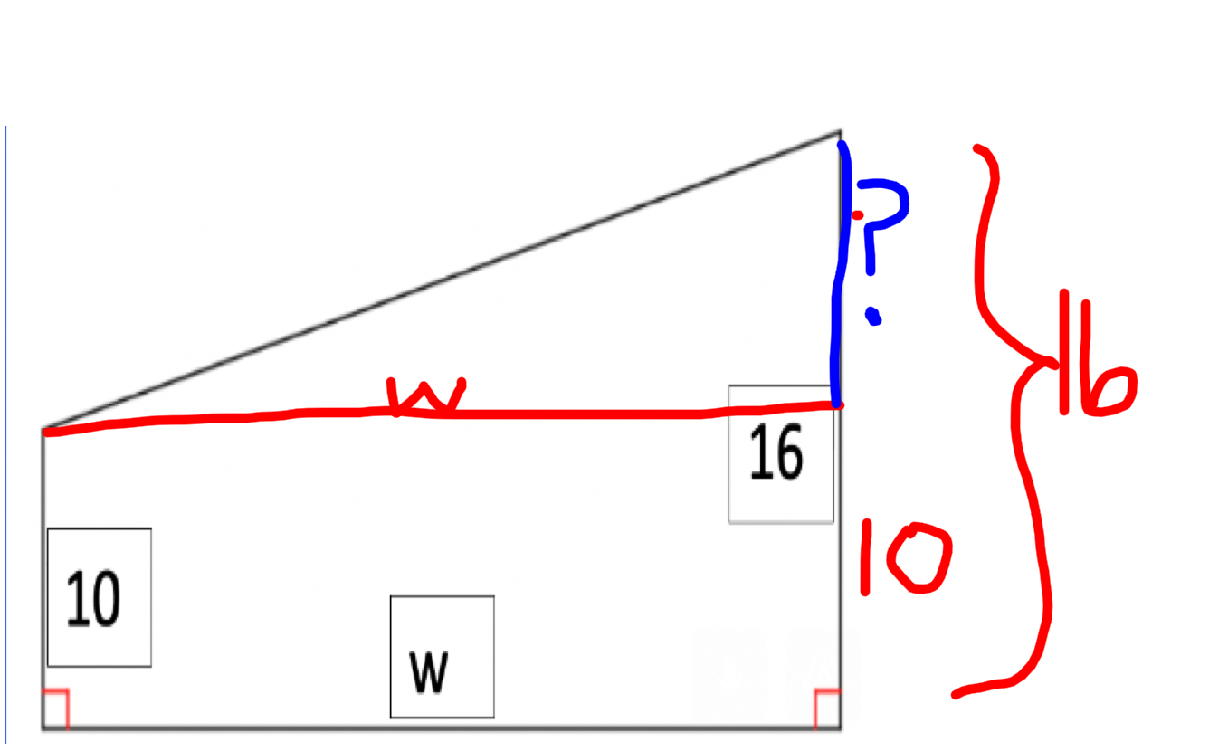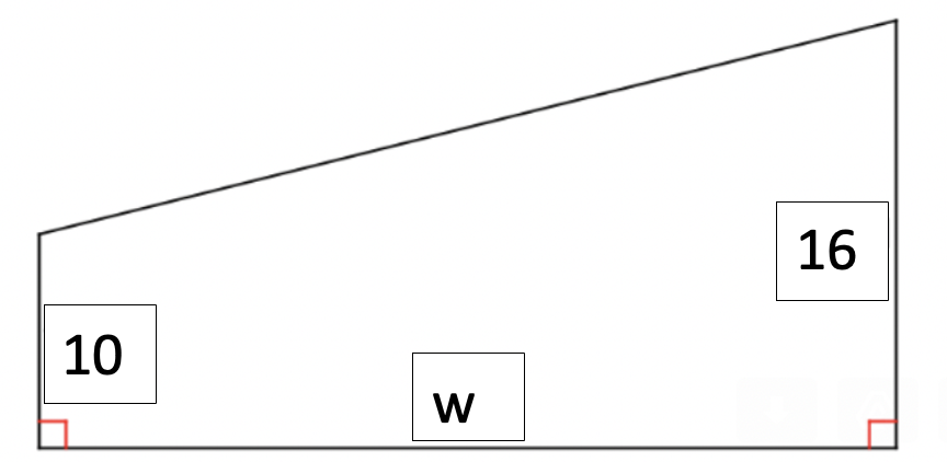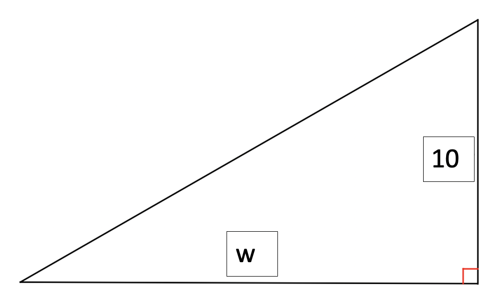 The roof of a shack is drawn below (not to scale).The slope of the roof is 3/7.What is the width of the roof (w in the diagram) Step 1: Identify important parts of the triangle.Find the value of the blue line. (hint: subtract)