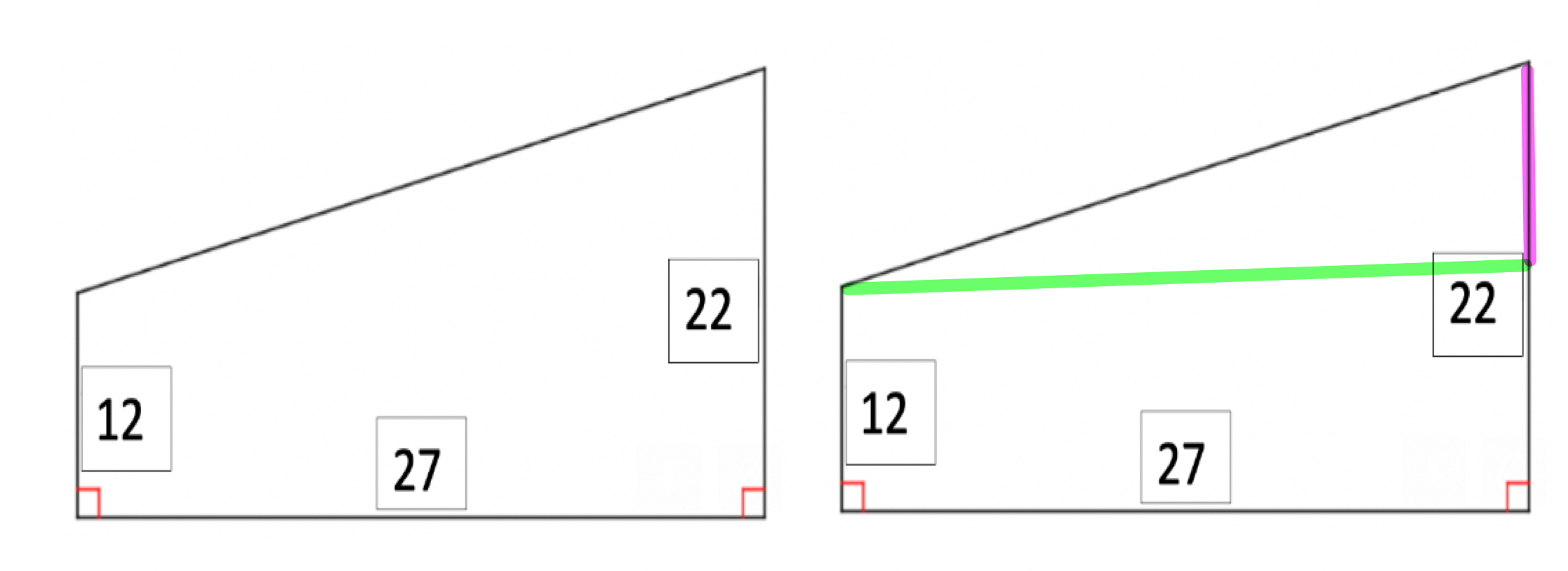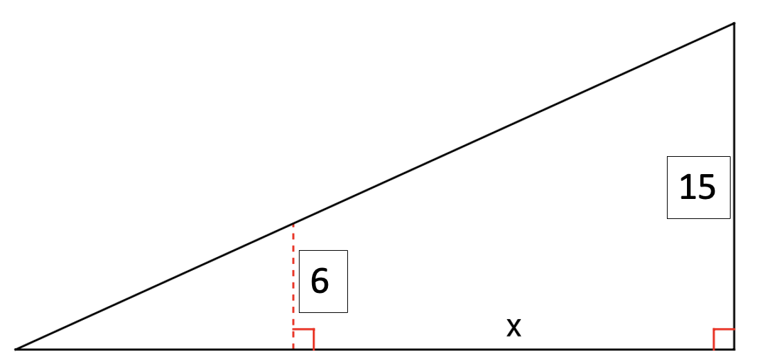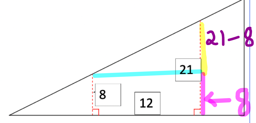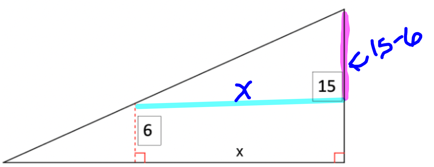 The roof of a shack is drawn below (not to scale).The slope of the roof shack is 3/7. What is the value of x in the diagram?(x is the distance from the dotted segments to the right side) Step 1: Identify important parts of the triangle.What is the length of the pink line?