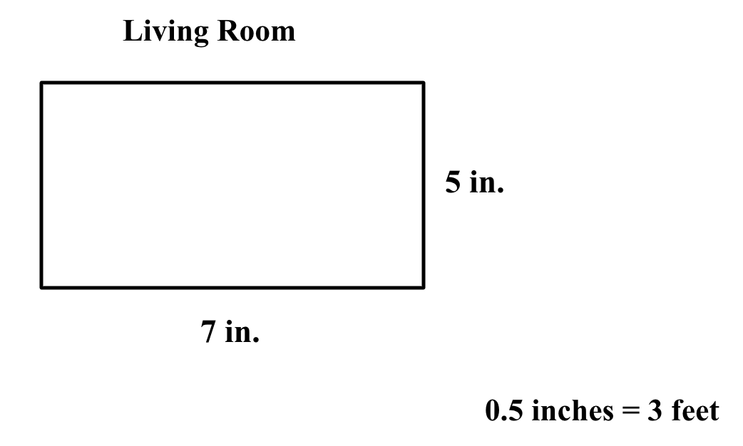 A home decorator is adding new flooring to a living room using the blueprint below. The length is 7 in. and the width is 5 in.