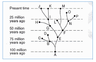 The diagram to the right represents possible evolutionary pathways of certain organisms. Which species is most closely related to species L?