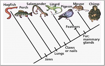 Scientists are studying the evolutionary history of a group of animals and they developed a cladogram, as shown above. What information about the organisms’ best helps the scientist to determine the evolutionary relationships among them?