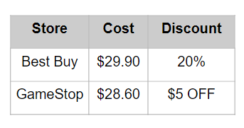 Compare the price of a video game at Best Buy and GameStop. Which store would you save the most money to buy the game? (just type in the name!)