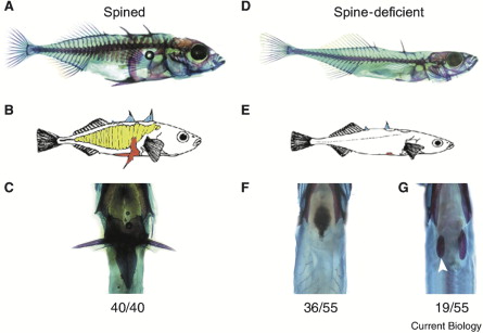 Which description could be a possible reason for the loss of the pelvic spine in the stickleback fish population over many generations (between points C and D on the graph)? (9L.2.1.1.2 standard 1)