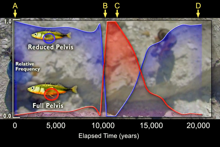 What would likely happen if variation for the full pelvis trait did not exist in the population of stickleback fish at point B on the graph? (9L.2.1.1.2 - standard 1)