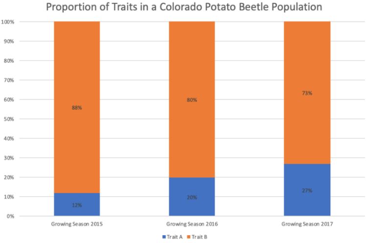 Which trait (A or B) is more likely to make the Colorado potato beetles resistant to the pesticide that is applied in future growing seasons? ( 9L.3.2.1.5 - standard 3)