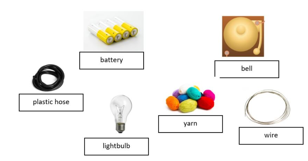 Mr. Streeter put different objects on a table. He wanted his students to choose the objects that would make a complete circuit producing sound. Which objects would his students need in order to make the circuit?