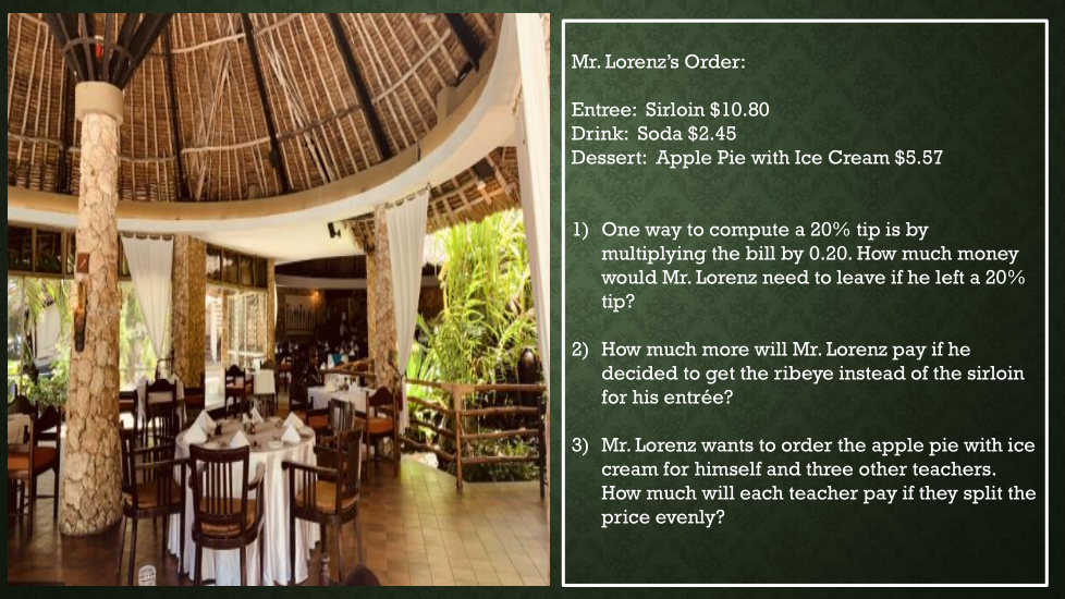 One way to compute a 20% tip is by multiplying the bill by 0.20. How much money would Mr. Lorenz need to leave if he left a 20% tip?